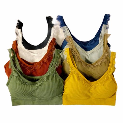 Crop Top inalámbrico en algodón poliéster y encaje Swiss, con copa y sin aros metálicos. Vienen en tallas estándar y colores surtidos (todos los colores publicados).