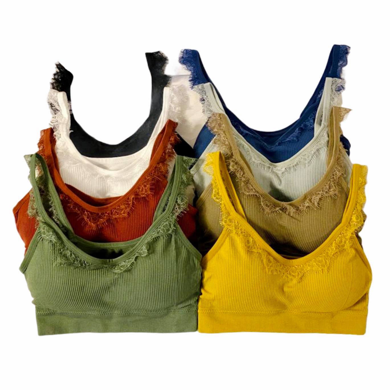 Etiquetas: Algodón poliéster, colores variados, con copa, encaje Swiss, sin aros metálicos, talla estándar
